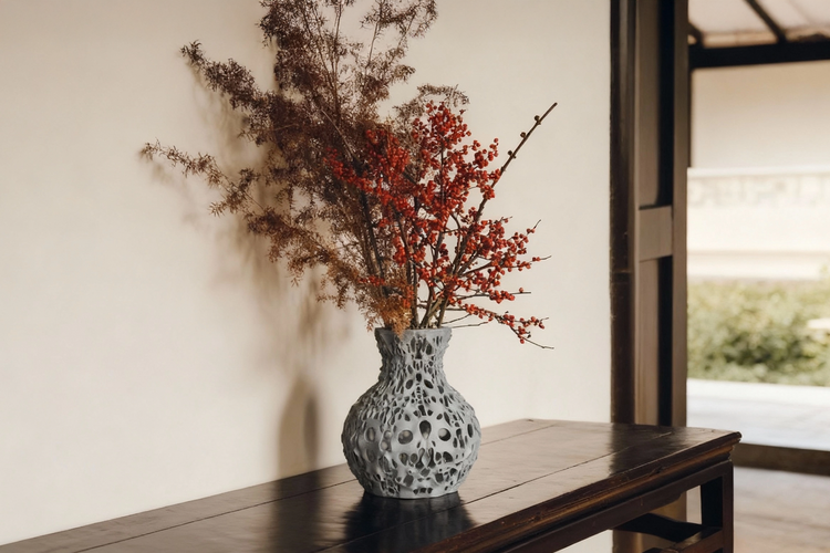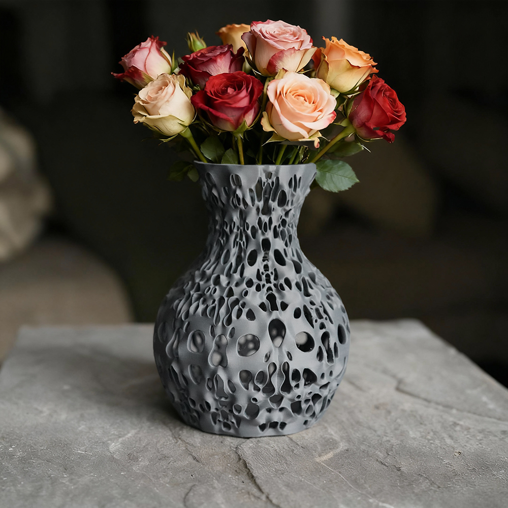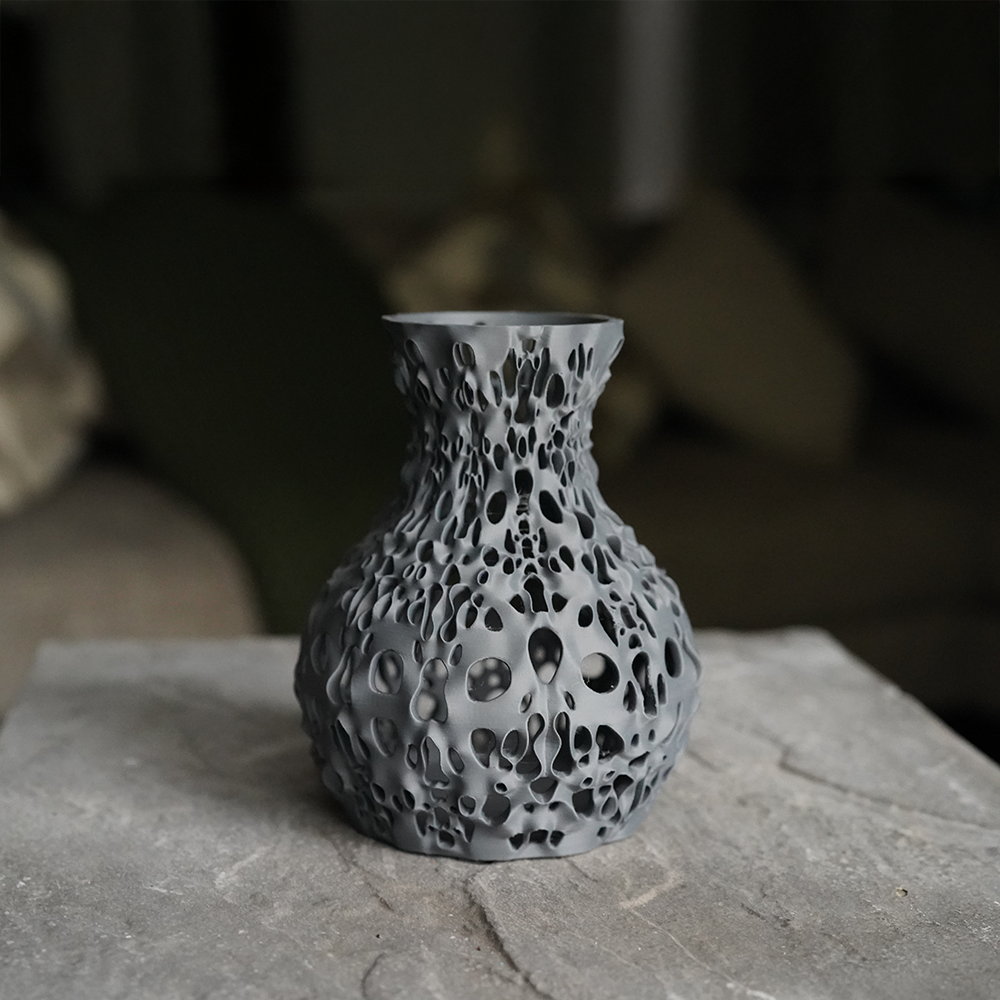 Scorria captures the aftermath of fire in sculptural form. Its pitted surface reflects heat long vanished, each opening a fossil of energy released. Light filters through its openings, turning each vase in a story of fire and time.