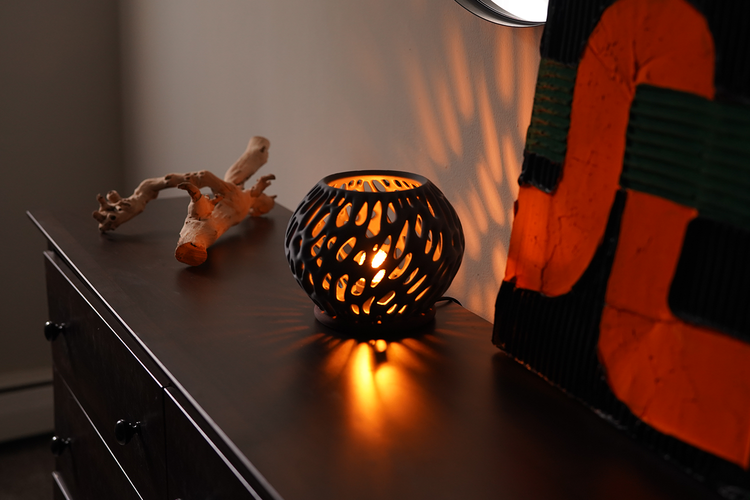 Materials: PLA shade; wood PLA hybrid base; unglazed porcelain socket; cloth-covered cord with switch; LED bulb