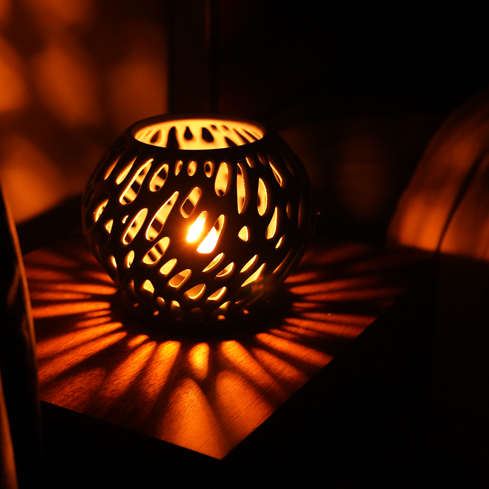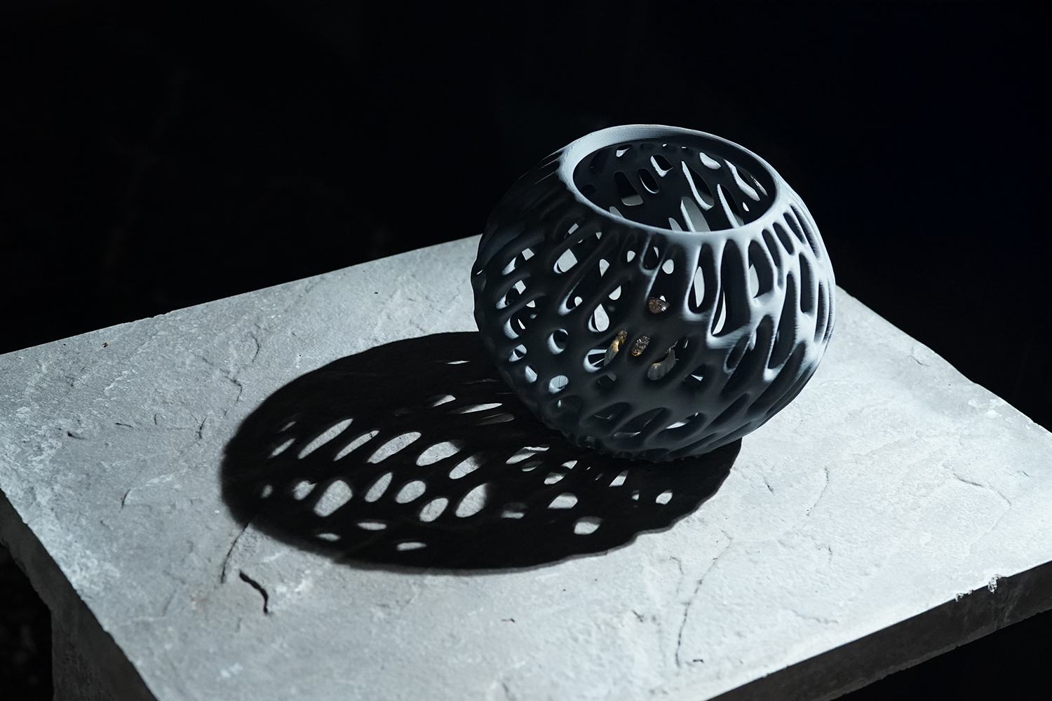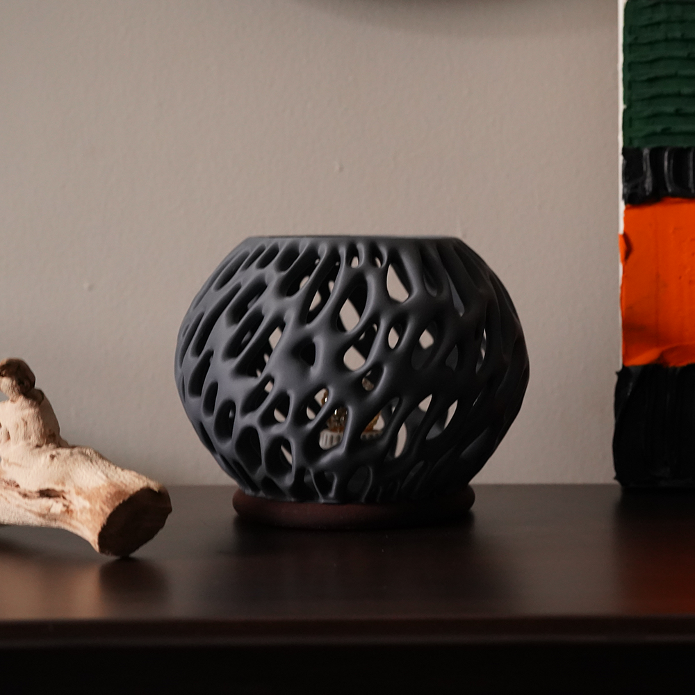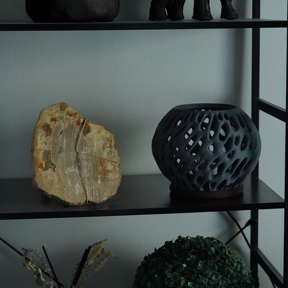 Vularic channels the structure of cooled lava — porous, layered, immutable. Its surface, coarse and open, releases light as if from beneath the surface. A shape that holds its own gravity.